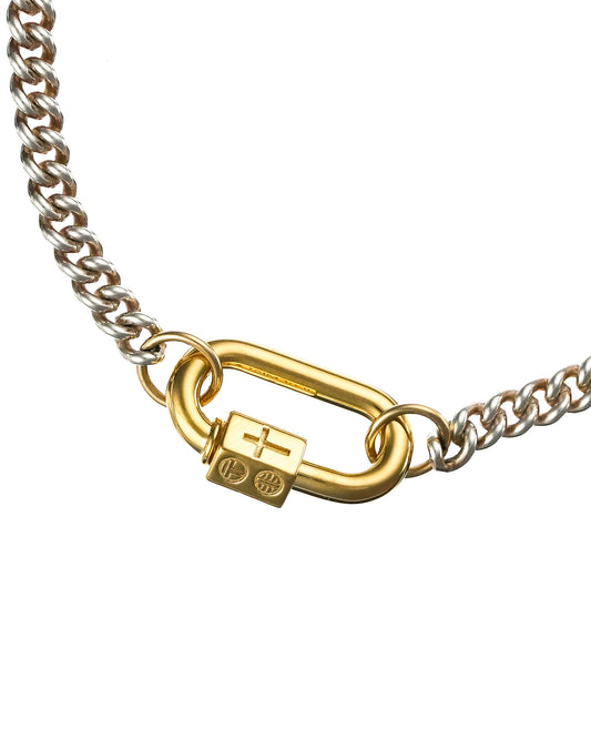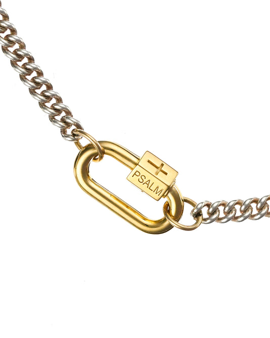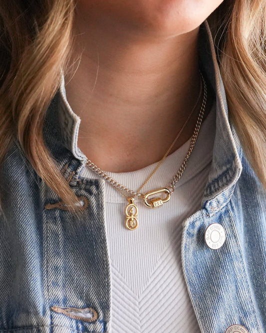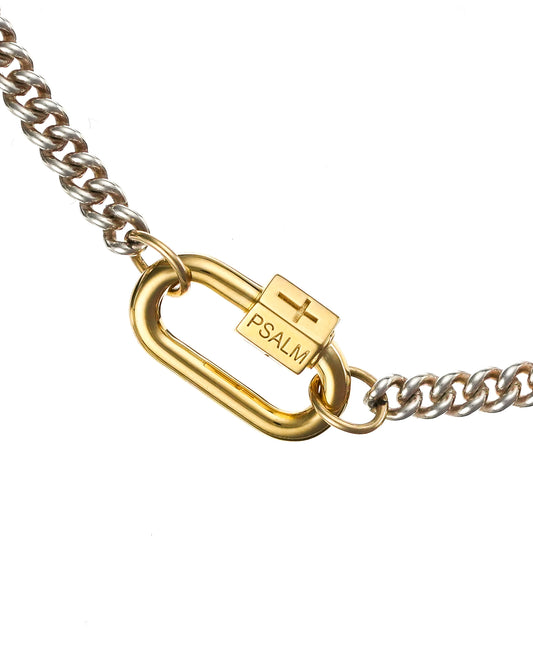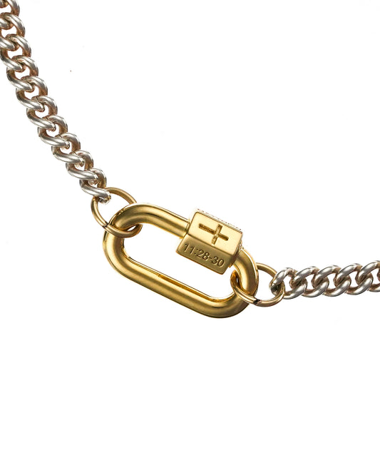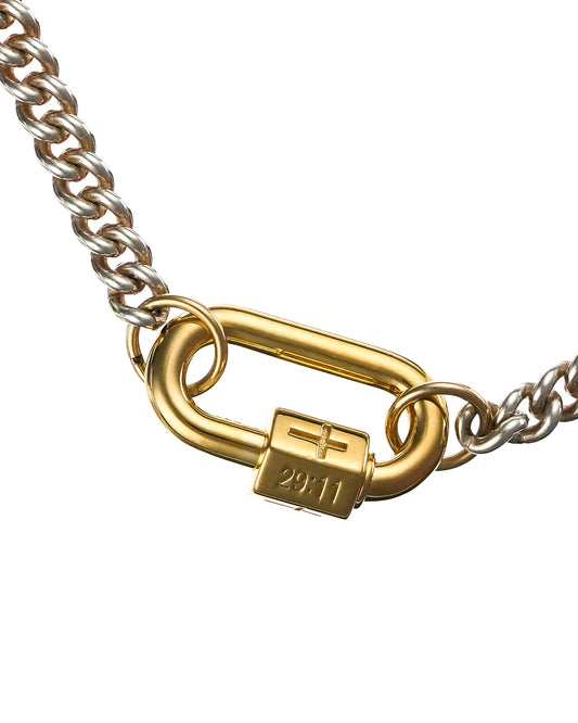 Our five-sided carabiner lock is designed to be stacked! On each side of the lock something meaningful is inscribed - The chapter name, the chapter and verse numbers, crosses, and the 29 and 11 logo. The Jenn Carabiner comes with our weighty rounded sterling silver or gold curb chain. The Jenn will elevate your stack and marry with your other personal pieces of significance.